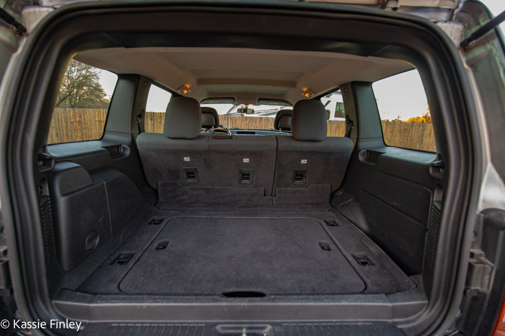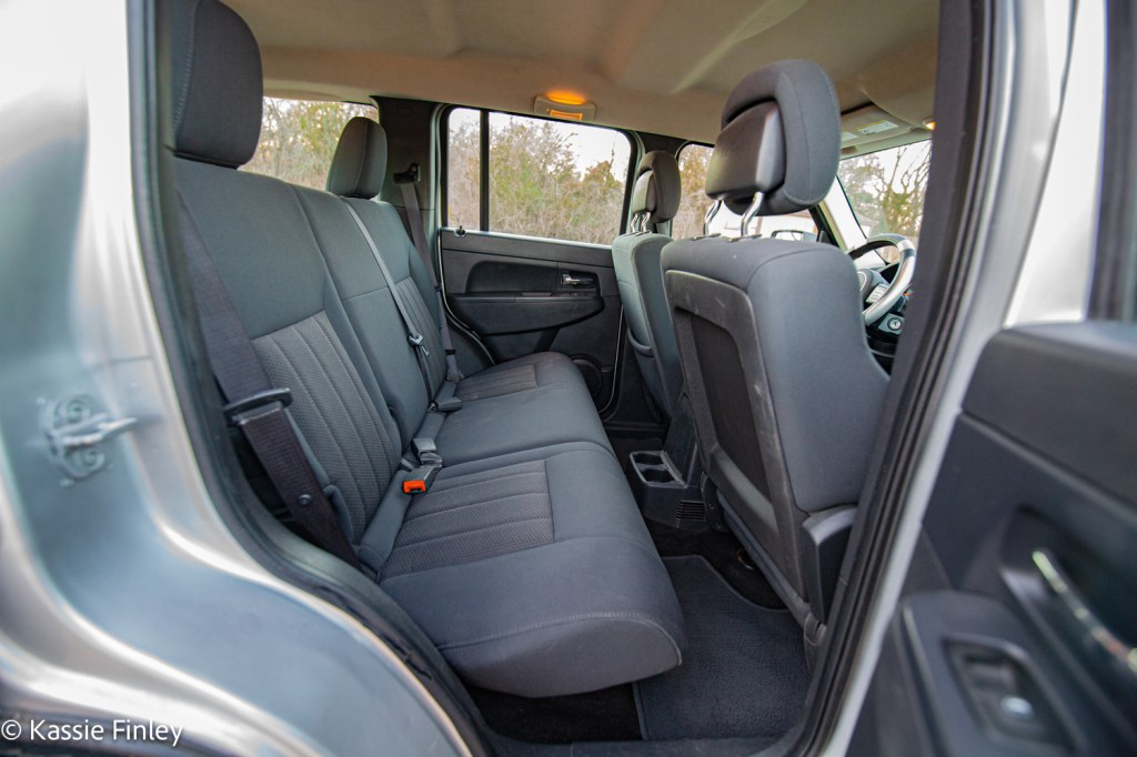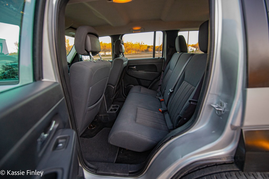 The Liberty’s interior matches its exterior with simple straight clean lines in the cabin. It’s divided both horizontally, by dash trim and a passenger-side grab bar, and vertically, by the large center stack. The Liberty also features a standard 60/40-split folding rear seat giving it 26.1 cubic feet of cargo space. Folding them expands cargo capacity to 62.4 cubic feet. It has a split tailgate allowing entrance to the cargo area through the glass removing the need to open the entire gate.