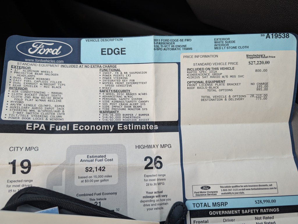 Edge’s 3.5-liter V6 has been upgraded for 2011 to deliver 285 horsepower, a 20-hp gain. EPA fuel economy estimates stand out at 19 mpg city/27 mpg highway and 22 mpg combined.